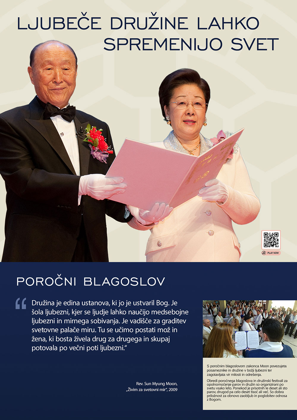 Poroka je več kot preprosta združitev moškega in ženske. To je dragocena slovesnost, ko sprejmemo, da bomo nadaljevali Božje delo stvarjanja. Poroka je pot, na kateri moški in ženska postaneta kot eno, ustvarita novo življenje in vzpostavita pravo ljubezen. S poroko se ustvari nova prihodnost: oblikujejo se družbe; zgradijo se narodi. Božji svet miru se realizira s poročenimi družinami v središču. V družini se ustvari Božje kraljestvo. Torej, možje in žene morajo biti središča miru.