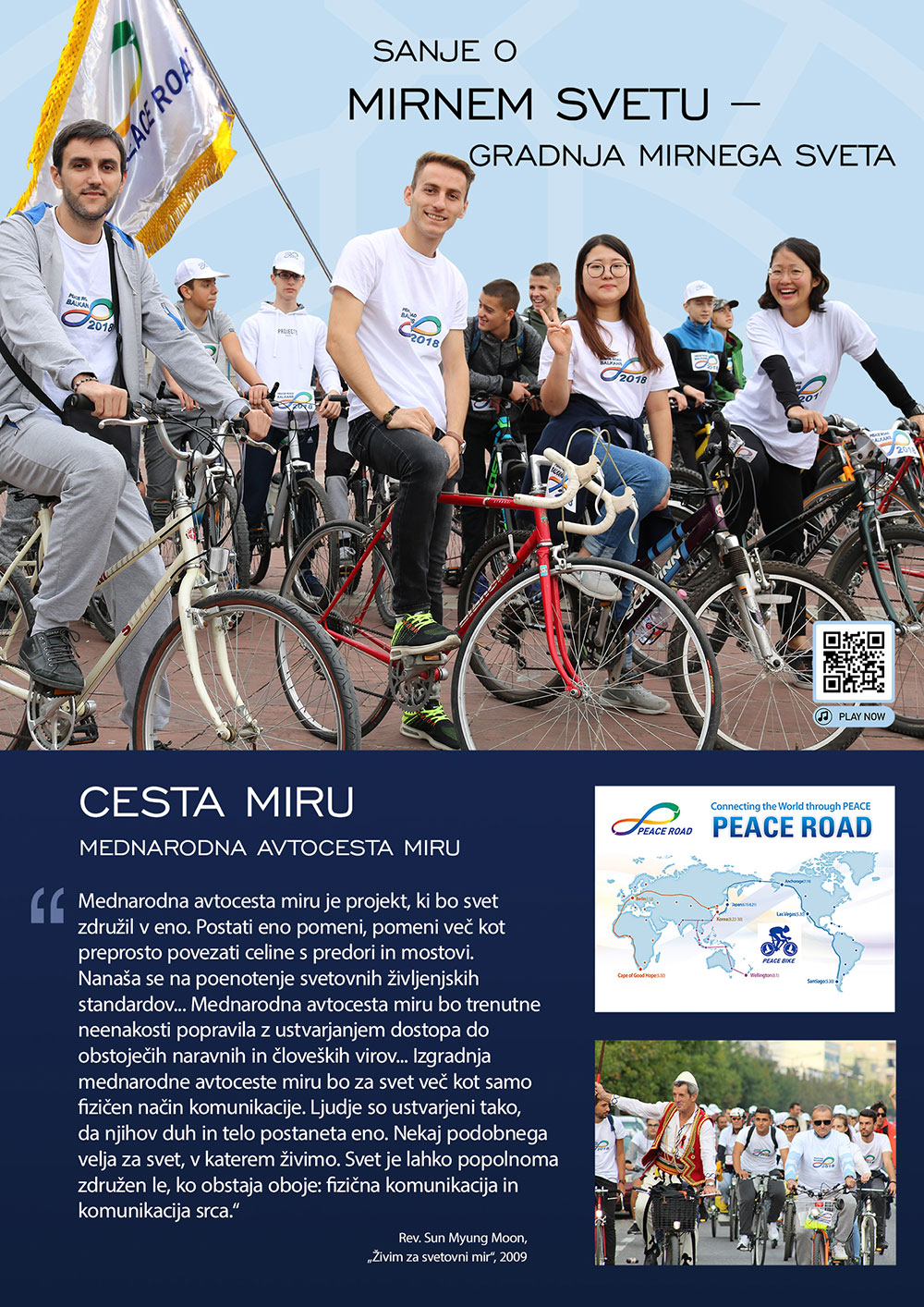 Že leta pozivam k obstoju sveta, v katerem vse religije sobivajo v sožitju, vse rase živijo kot ena in vsi narodi živijo složno. Pa vendar se že več tisoč let ljudje razdvajajo. S pojavom novih religij ali režimov so se zarisale nove meje in bojevale nove vojne. Sedaj živimo v dobi globalizacije. Za boljšo prihodnost se moramo poenotiti. Pri tem nam lahko pomaga mednarodna hitra cesta miru, ki je velik zalogaj.